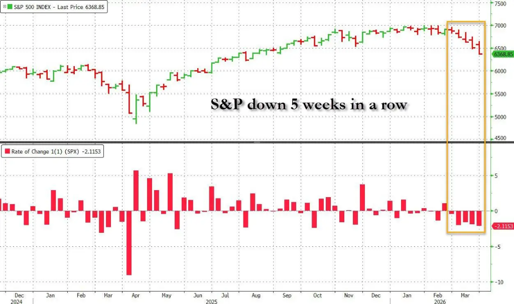 高盛资深往复员Cullen Morgan在周末论说中写说念,“周五是近期牵记中最令东说念主不适的往复日之一”。标普500指数创下1970年以来历历的五连跌记录,此轮下降的合手续性以致高出了2020年新冠疫情冲击和2025年“摆脱日”抛售。