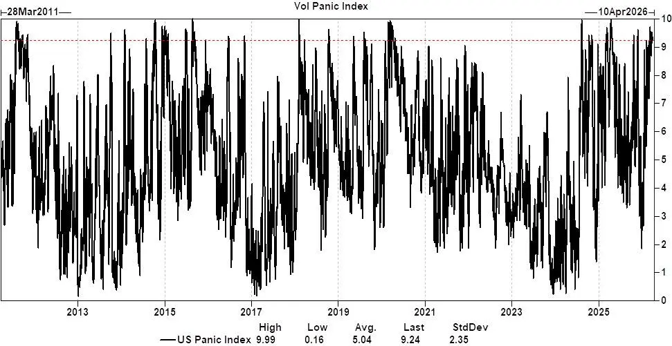 高盛好意思股波动心焦指数最新读数达9.2分(满分10分),已连结17个往复日处于“心焦区间”(8.5分以上),为夙昔15年最长连结心焦记录之一。